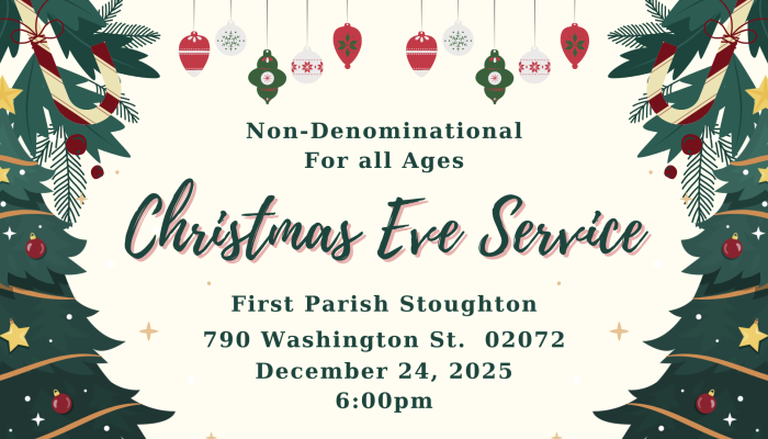 Join First Parish of Stoughton on Christmas Eve for a service of Peace, Community, and Carols. Our Christmas Eve service is for all ages and we encourage families with children to attend, as a centering event for their holiday. Our service focuses on the … read more.